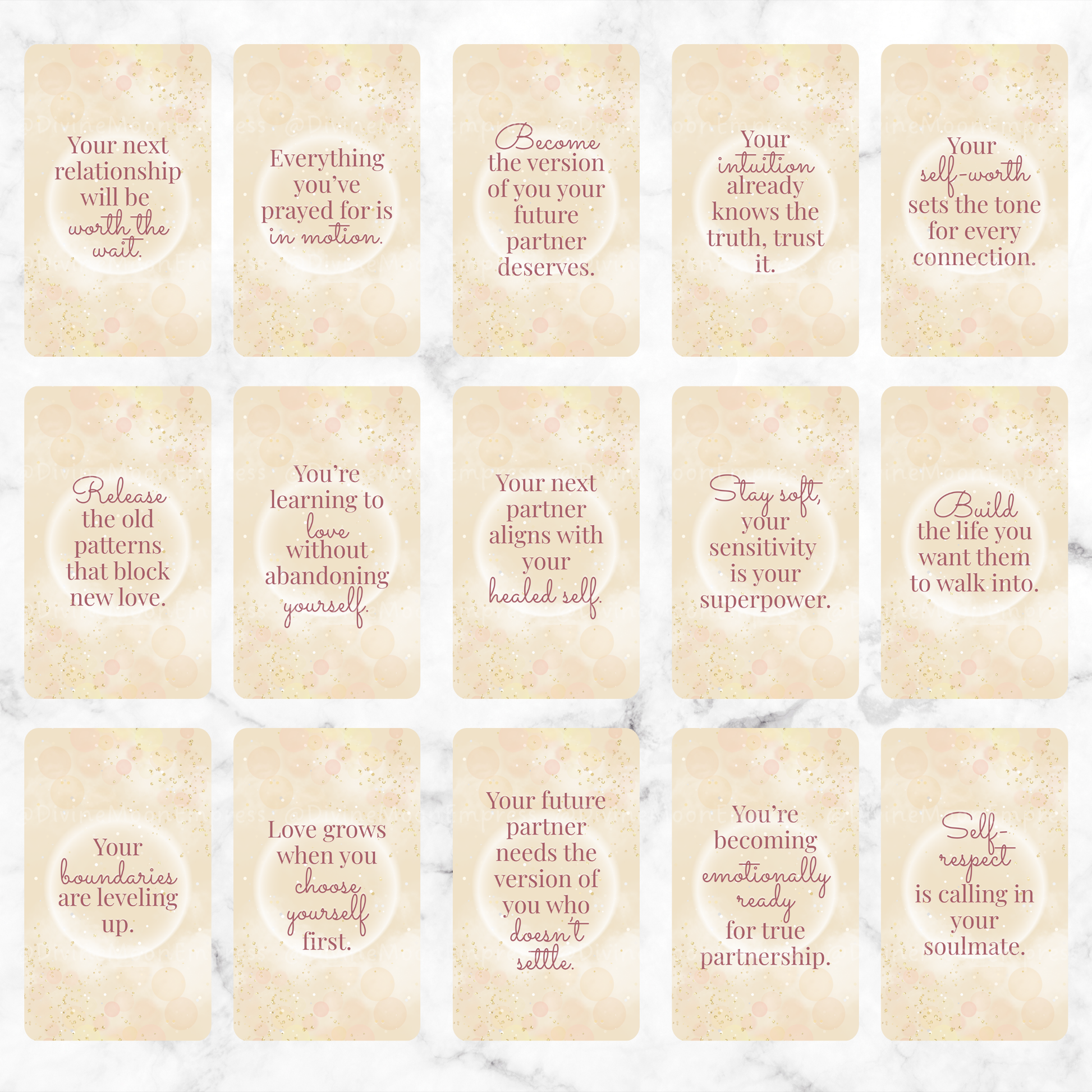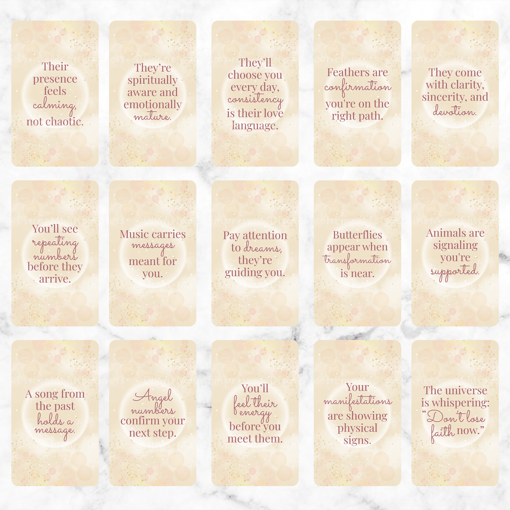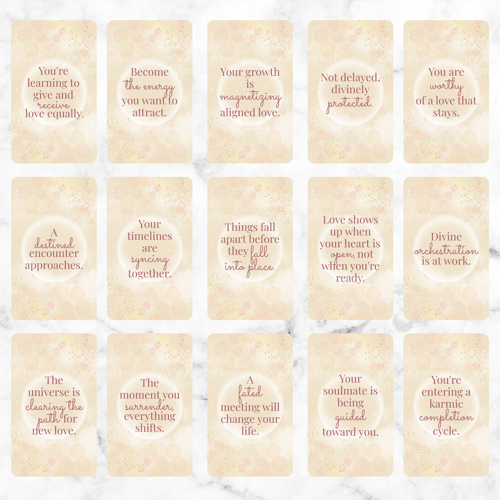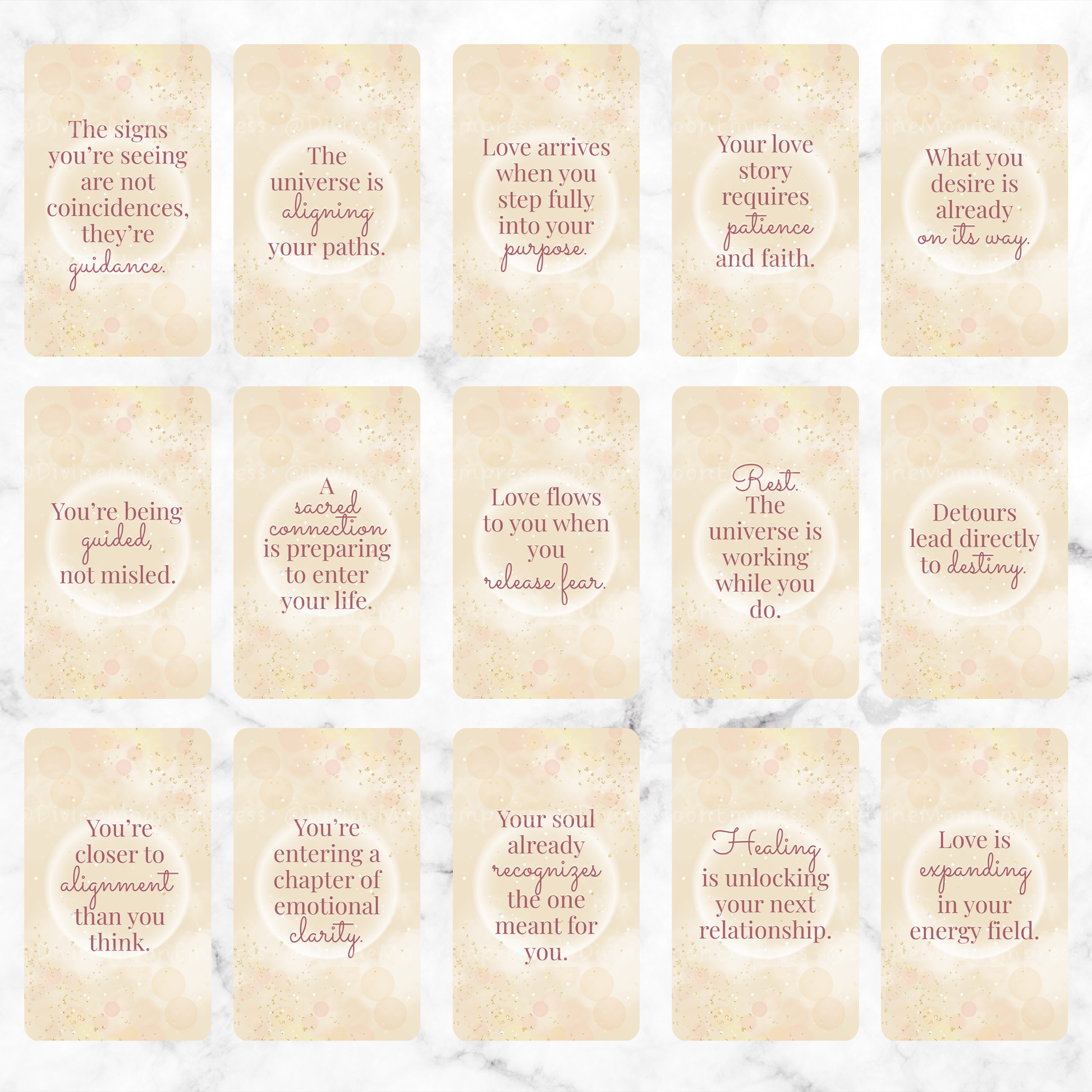 Designed with soft blush tones, lace textures, golden sparkles, and a warm halo glow, each card offers gentle guidance, divine timing messages, future partner insights, and the signs the universe is sending you along the way.