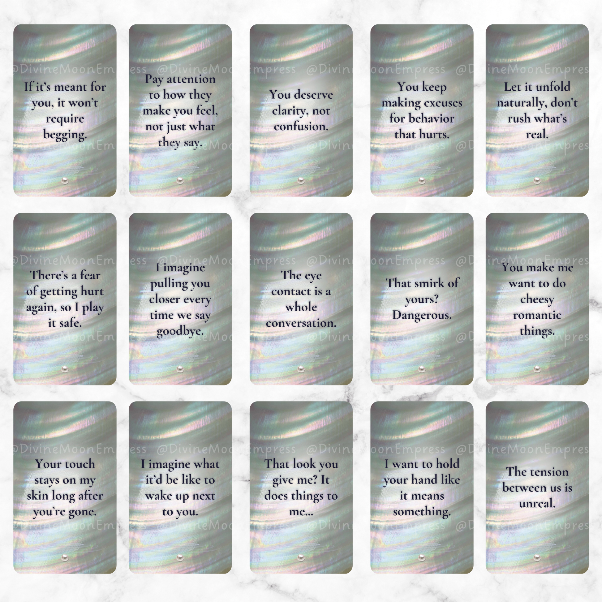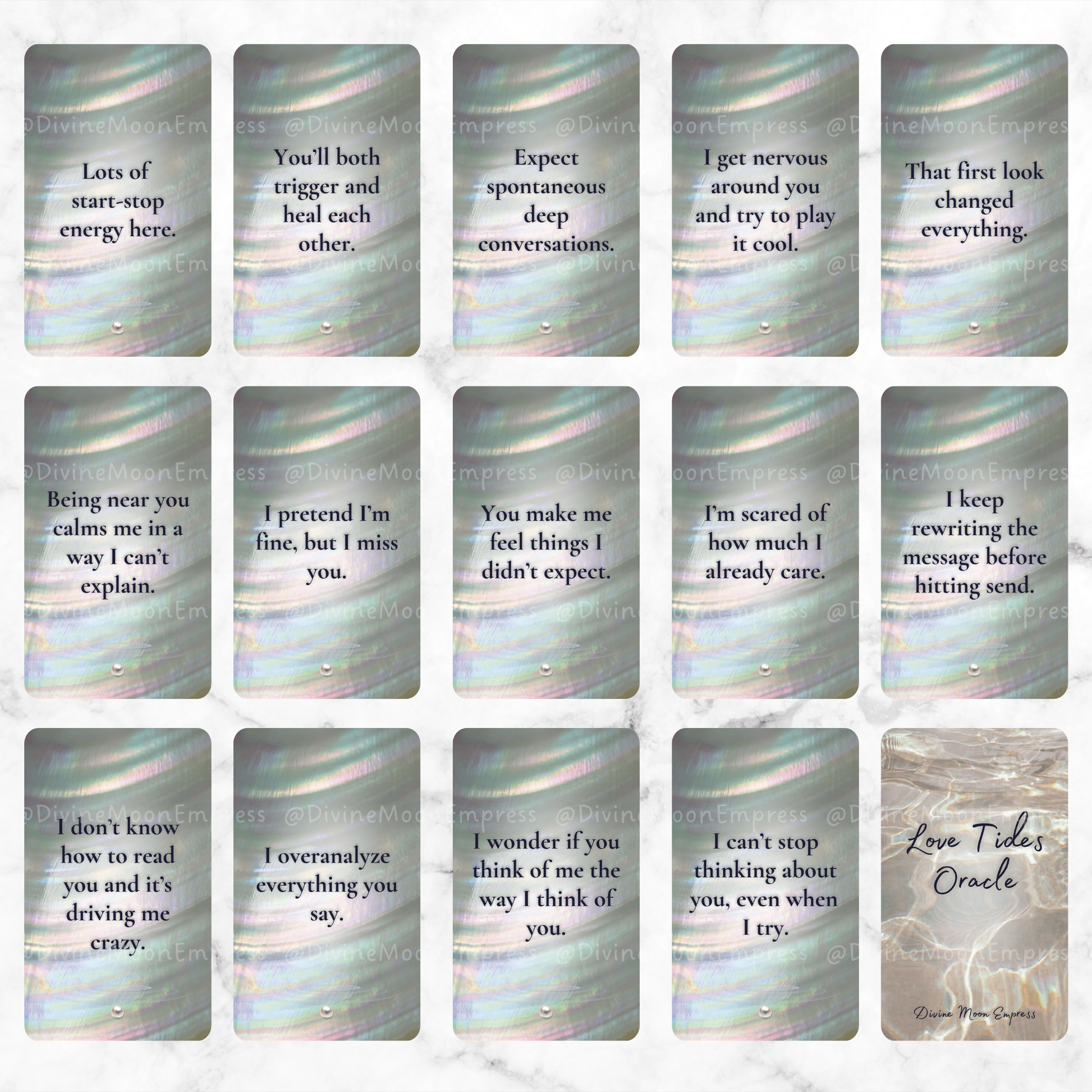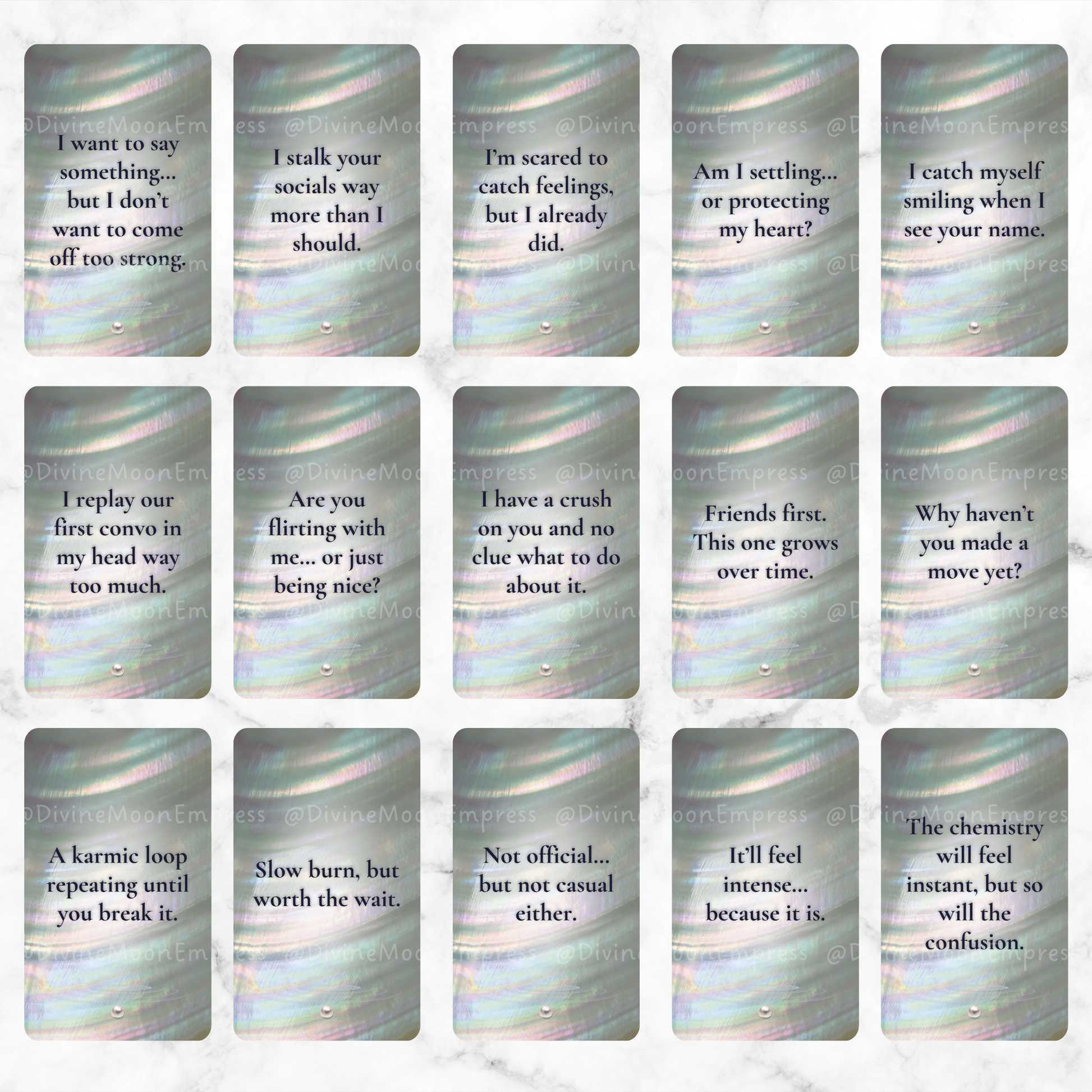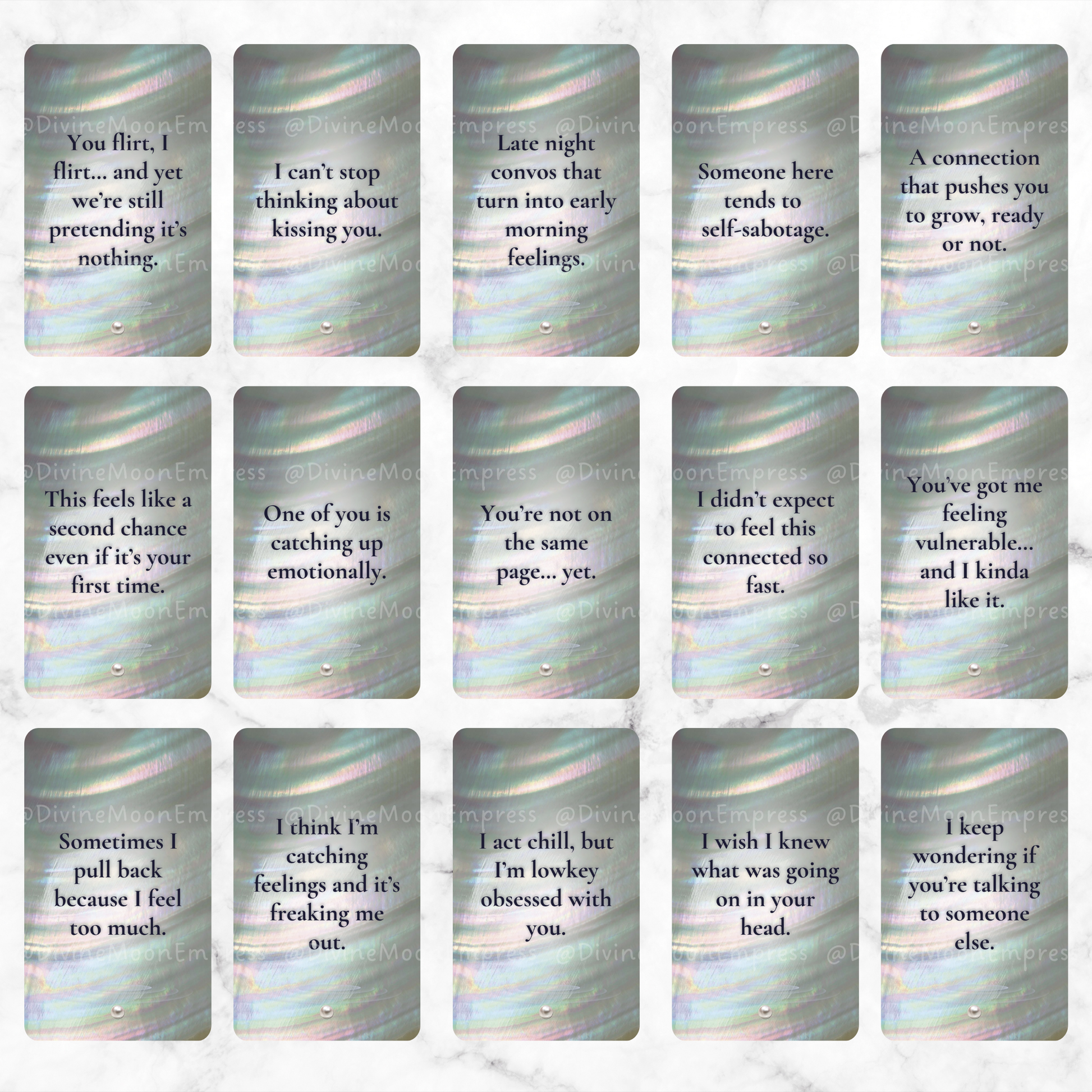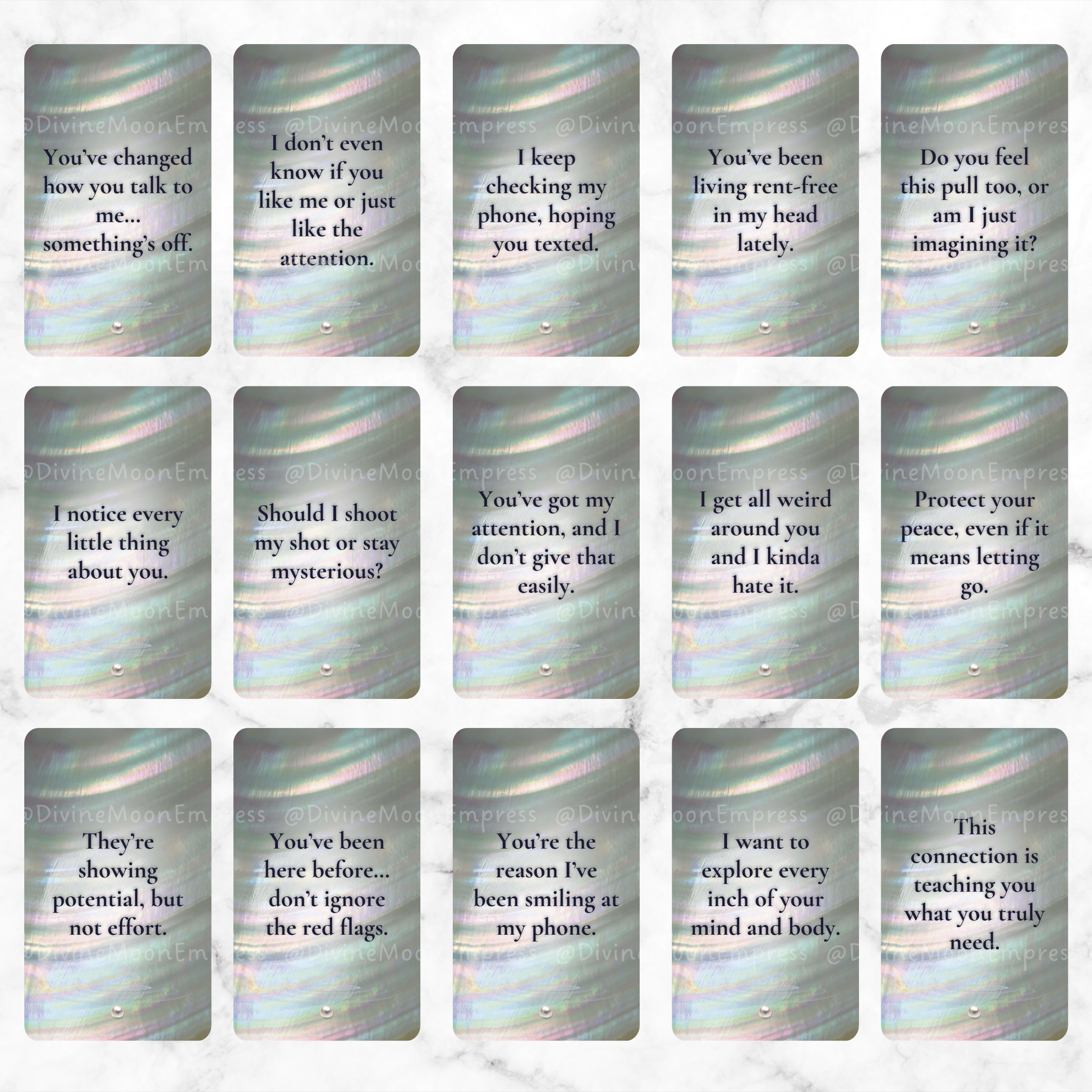 Each card is created with a dreamy pearl-water aesthetic and speaks directly from your person’s POV, helping you tune into the emotions, intentions, tension, and chemistry of your connection.